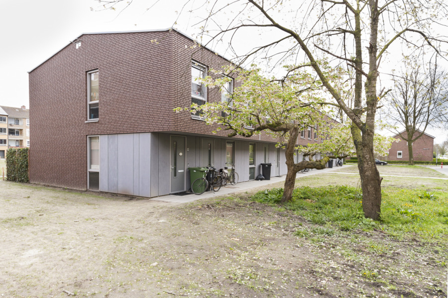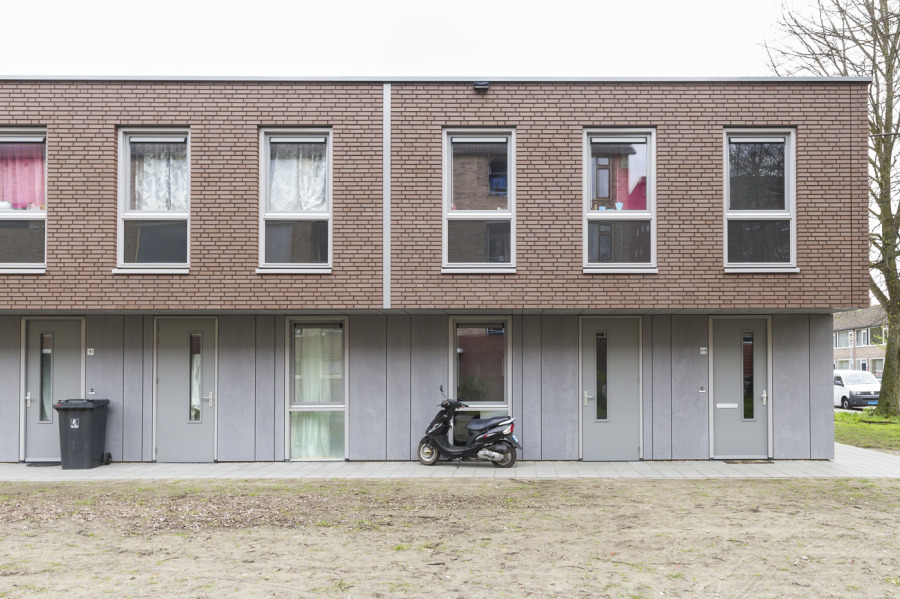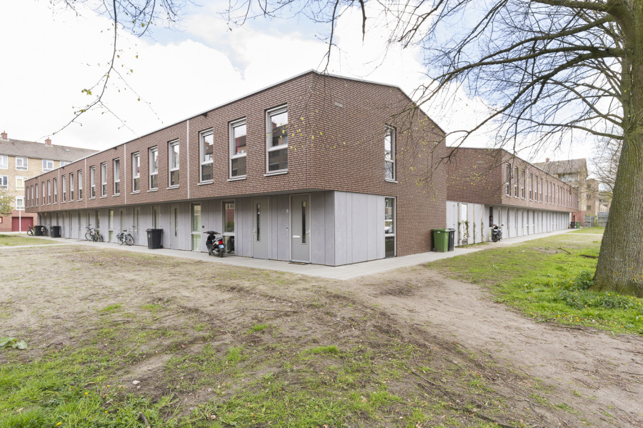 De nieuwe woningen worden ontsloten vanaf de straat en vanuit de half-openbare tuin, waaraan ook de privétuin grenst. Hierdoor wordt er zowel aan de binnentuin als aan de straatkant gewoond. Aan de straatkant vormt de overkragende bovenverdieping en de grijze gevelbeplating een 'erfzone'. De voor sociale woningbouw brede beukmaat (7,2 meter) maakt een inpandige berging mogelijk. De ontworpen erfscheidingen moeten verrommeling van het binnengebied zoveel mogelijk voorkomen.