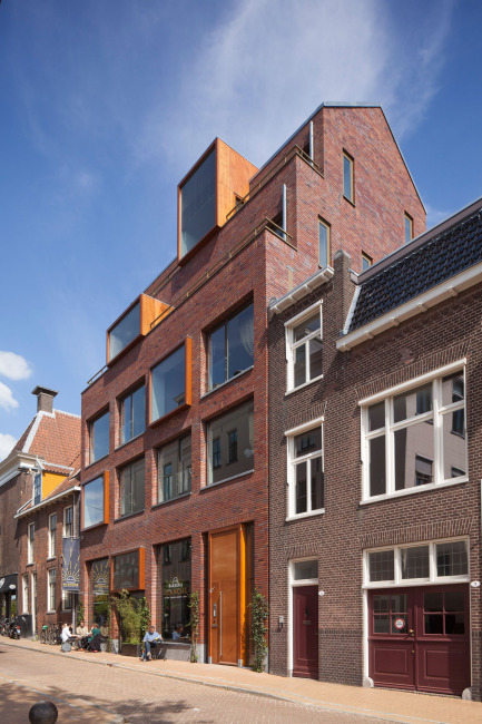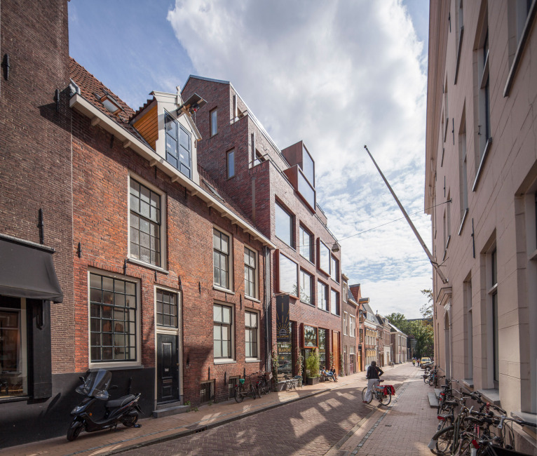 De straatgevel is slechts drie bouwlagen hoog. De twee bovenste lagen zijn teruggelegd; zij hebben elk een ‘setback’ om het op zijn New Yorks te zeggen. Het bakstenen gebouw verjongt ook aan de achterkant. De bovenste bouwlaag, bekroond met een zadeldak, is hierdoor relatief klein. De nok loopt evenwijdig aan de Kleine der A en parallel aan de kappen van de Brugstraat.