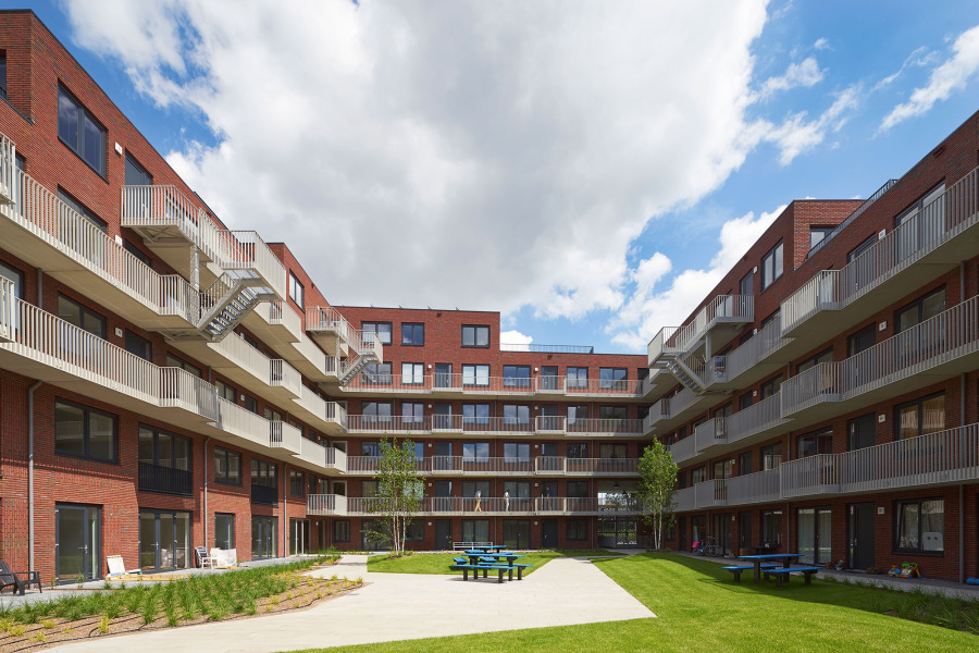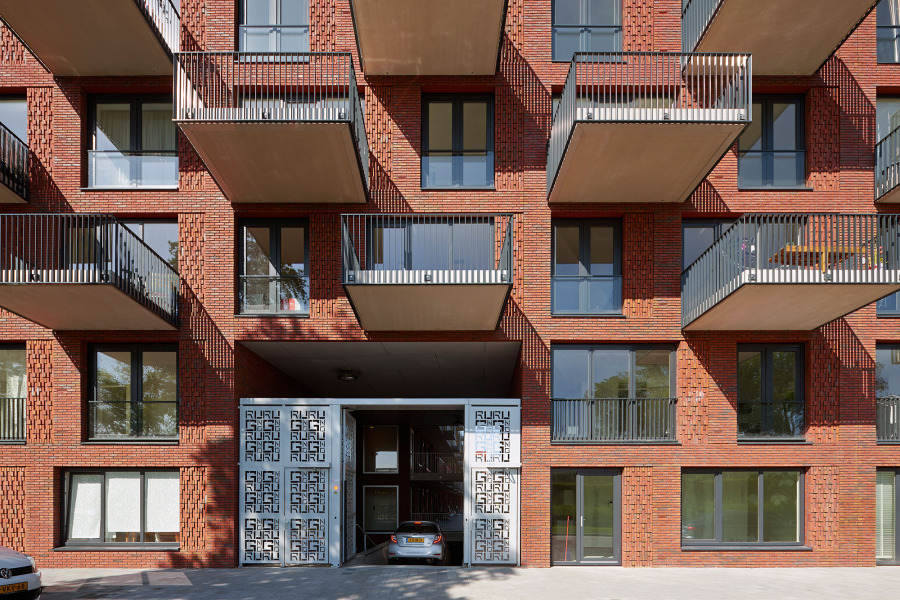 Roodbruin metselwerk met zwartgrijze kozijnen geven eenheid aan de gevels. De vensters aan de straatzijde zijn verdiepinghoog. Een verticaal gemetseld vlak met veel relief naast elk venster biedt visuele afwisseling aan de passant. De buitenruimten van de appartementen variëren in vorm: een Frans balkon, een balkon dat half uit de gevel steekt, de kopwoningen hebben een dakterras. Aan de kopse kanten van het bouwblok, waar de openbare ruimte het grootst is, kragen de balkons volledig uit.