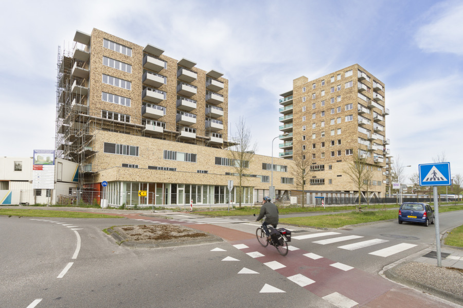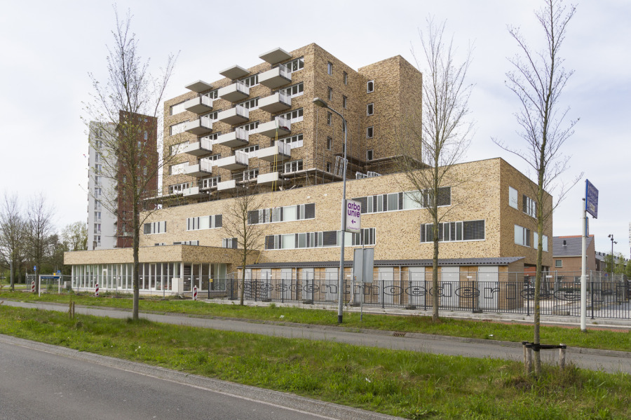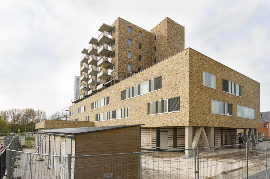 De nieuwe gestapelde woningbouw bestaat uit drie aparte blokken, zodat een gesloten muurwerking naar de woonbuurt is voorkomen. In het midden de toren (B) van elf bouwlagen en links en rechts galerijflats van negen (A) en zes bouwlagen (C).
