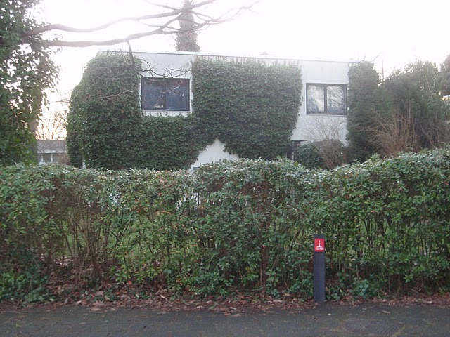 De buitenmuren geven de indruk van beton, maar zijn in feite gemetselde, dragende muren die zijn bedekt met pleisterwerk. Het haaks op de voorgevel staande muurtje, links van de voordeur, bestaat uit schoon metselwerk dat zich langs de voordeur de hoek omvouwt en zet zich voort in de zijgevel. De gebruikte bakstenen zijn buitengewoon grillig van vorm en de voegen zijn zeer diep.