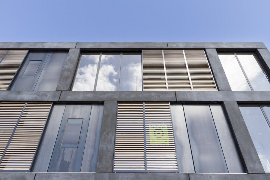 De voorzijden (de noord- en westkant) zijn met veel meer expressie uitgevoerd. Duidelijk zichtbaar zijn de antraciete prefab betonelementen (vertaling betonskelet). De verspringende constructie toont de dynamiek van het gebouw. In de tussenliggende vlakken zijn de glasopeningen geplaatst in combinatie met blank gelakte blauwstalen platen. In deze gesloten vlakken bevinden zich de draaiende delen, eveneens bekleed met blauwstaal. Voor deze blauwstalen- en glasvlakken is in de westgevel zonwering geplaatst in de vorm van mechanisch schuivende panelen met houten lamellen. In dit gebied profileert dit bedrijfsverzamelgebouw zich als een moderne versie van het industrieel bouwen.