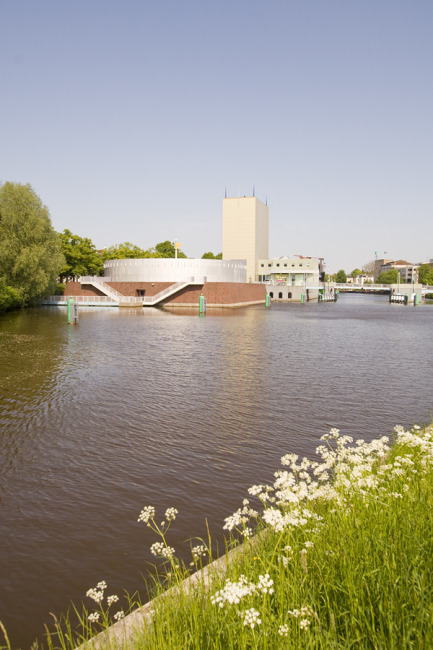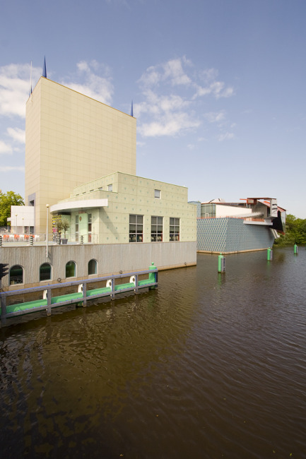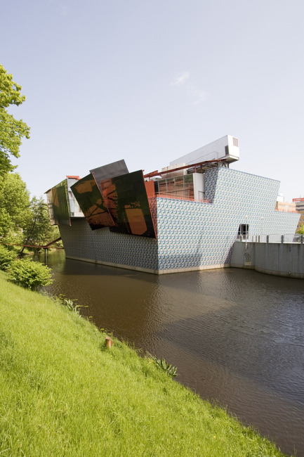 Centraal op het museumeiland staat een gouden toren waarin de ‘kunstschatten’ liggen opgeslagen. Onder dit depot is de ingang gesitueerd. Ten westen van de toren liggen twee paviljoens op elkaar. Het onderste, naar ontwerp van Michele de Lucchi, was bestemd voor de presentatie van de geschiedenis van stad en provincie Groningen. Vandaar ook de bekleding met de typisch Groninger rode baksteen. Tegenwoordig worden in dit paviljoen de werken van de Groninger kunstenaarsgroep De Ploeg getoond. Boven op het bakstenen deel ligt een schijfvormig paviljoen van de internationaal vermaarde ontwerper Philippe Starck. Hier bevinden zich de voorwerpen op het gebied van kunstnijverheid. De aluminium schil aan de buitenkant is versierd met het reliëf van een vaas.