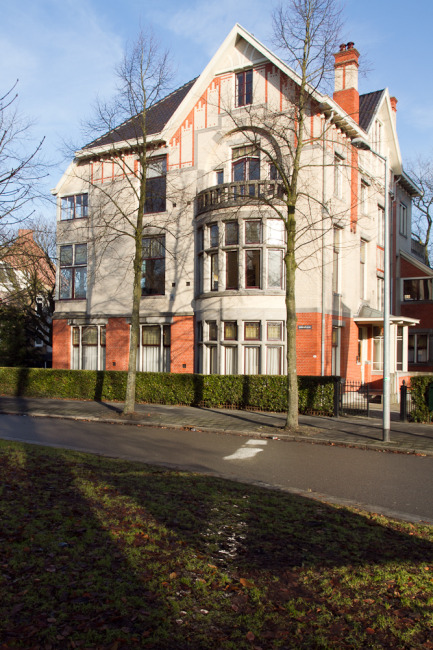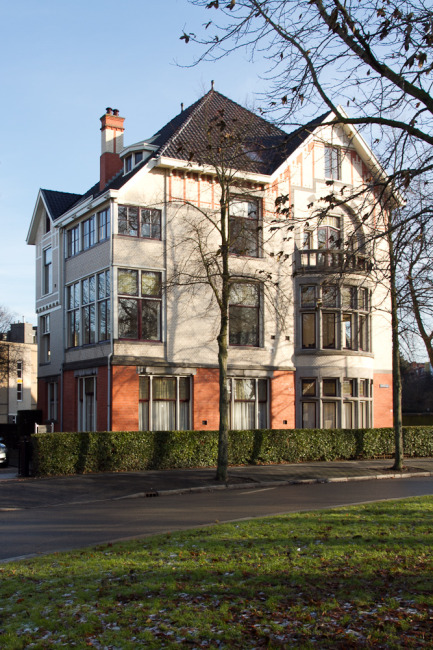 De grote ronde erkers ter hoogte van de begane grond en eerste verdieping aan de voorzijde vergroten het uitzicht op het Emmaplein. In de bovenlichten zijn glas-in-lood ramen aangebracht. In 1919 is de entree aan de voorzijde bij een eigenaarwisseling omgebouwd tot vensterraam.