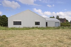 Door twee volumes met een gedraaide kapvorm te maken, oogt het gebouw minder massaal. In verband met de kosten is er niet voor metselwerk met een pannendak gekozen - ook al ging de voorkeur van de opdrachtgever hiernaar uit - maar voor een stalen skelet met HSB wanden en gevelbeplating. De opdrachtgever gaf de voorkeur aan dakpanplaten op het dak met horizontaal gelede profielen op de wanden. In goed overleg is er echter voor gekozen om alleen de dakpanplaten toe te passen waardoor de vorm van de volumes versterkt wordt.