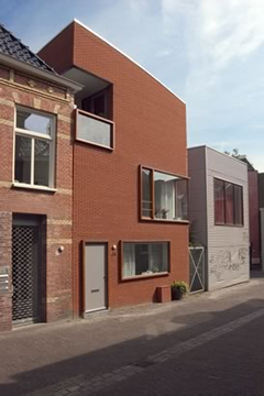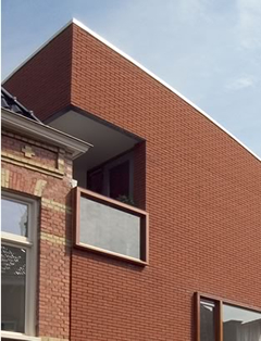 De stadswoning voegt zich strak in het ritme van de bestaande omliggende woningen, zowel in schaal als bouwhoogte. Het bouwwerk valt op door de van de normale bouwwijze afwijkende gevelbekleding. De bekleding bestaat uit een rode verlijmde baksteen. Er is dus niet op een traditionele wijze gevoegd waardoor de naad tussen de bakstenen kleiner is en ongevuld lijkt. Deze gevelbehandeling heeft tot resultaat dat er één optisch aansluitend kleurvlak ontstaat.