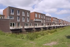 De verspringende woningen staan in een schuine lijn aan de weg en hebben een houten terras direct aan het water, met uitzicht op de groenstrook. De vensterindeling van de woningen is streng en heeft een doorlopend ritme. De woningen bestaan uit drie lagen en door de volumeopbouw en de vertanding ontstaat een strak, maar levendig beeld.