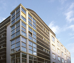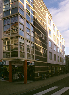 Doordat het complex met de lange kant aan een zeer nauwe straat ligt, heeft de architect op deze plaats gekozen voor het gebruik van lichte materialen. De gevel is voorzien van wit stucwerk. Dit zorgt, met de schuiframen en de afwezigheid van balkons, voor een lichte uitstraling. Tevens verraadt deze materiaalkeuze de indeling van het gebouw; de lichte gedeeltes markeren de woonbestemming, de bakstenen gedeeltes herbergen de gezamenlijke ruimtes en de commerciële functies. Ook de hoek van het gebouw is op verschillende manieren gedetailleerd.
