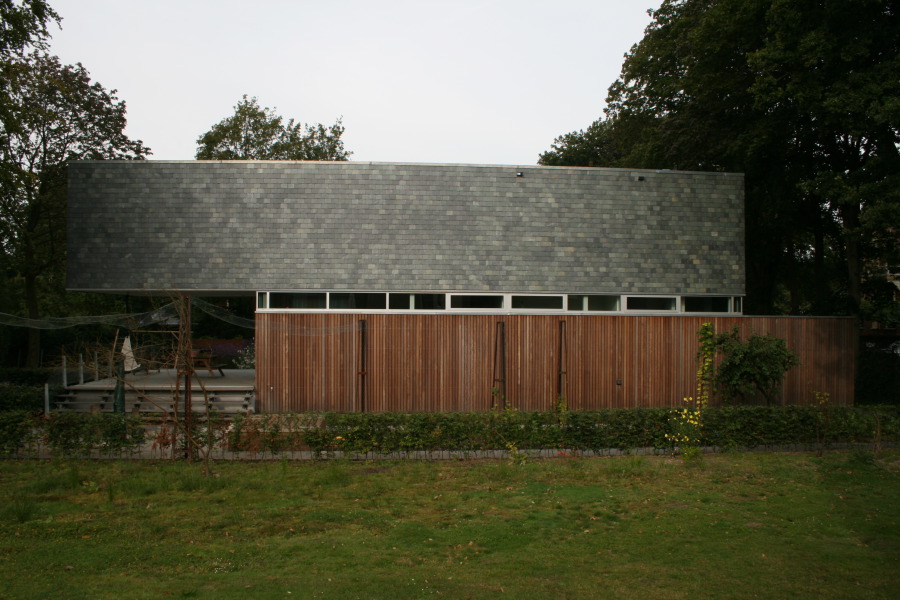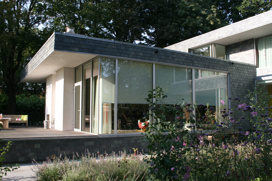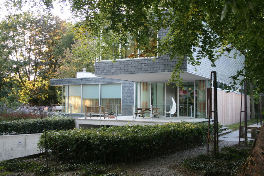 Het uiterlijk van de villa wordt bepaald door het gebruik van (Spaanse) leisteen. Dit materiaal geeft het gebouw een sjieke uitstraling; het vele glas op de eerste en tweede verdieping zorgt voor een open en vriendelijk karakter en geeft vanuit de gehele woning zicht op de tuin.