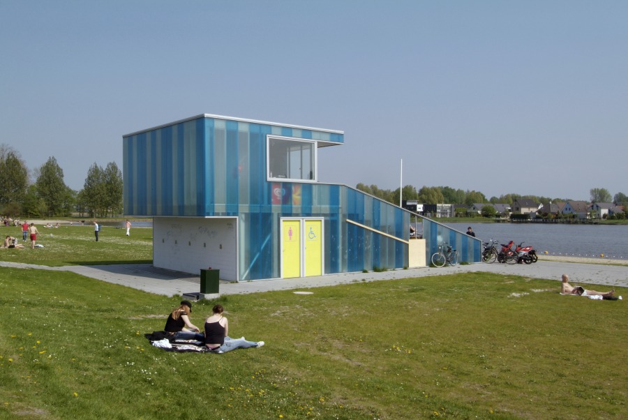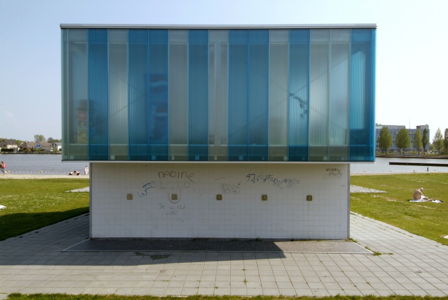 Het paviljoen is afgewerkt met licht- en donkerblauwe transparante platen. Deze opvallende afwerking maakt het paviljoen een herkenningspunt voor de badgast.