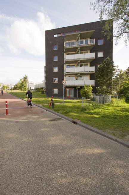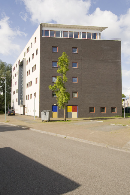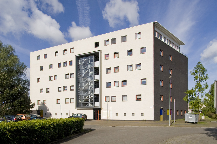 Het gebouw is opgedeeld in twee torens die zich van de grond los maken door een gekleurde plint van gele en oranje kleuren. Deze felgekleurde wanden op de begane grond, met daarachter de bergingen, schijnen door de glazen vlieswand heen en creëren hiermee een soort ‘lampioneffect’.