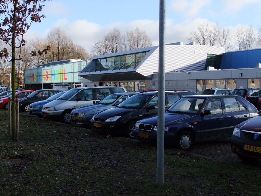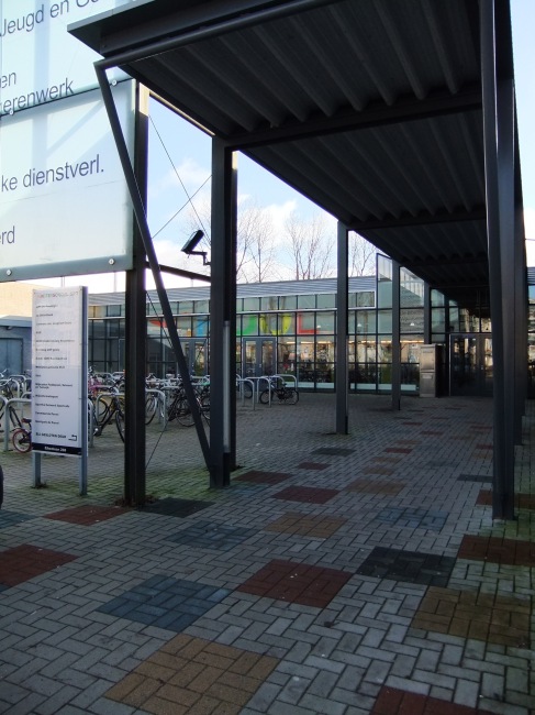 Deze vensterschool ligt enigszins verscholen achter de bestaande sporthal en zwembad. Bij dit gebouw is het daardoor meer het interieur dan de buitenkant dat de aandacht verdient.