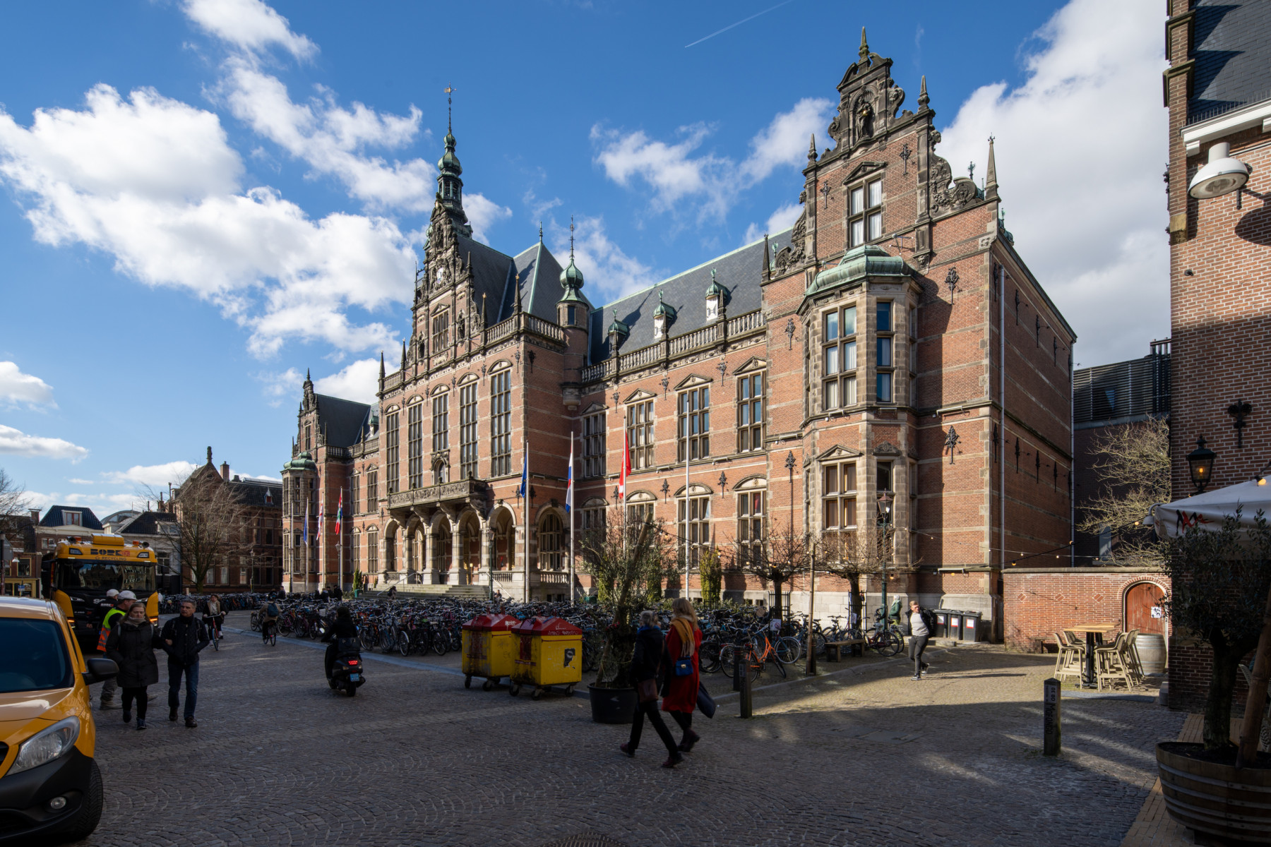 De uit roodbruine baksteen opgetrokken gevel is op tal van plaatsen verlevendigd met natuurstenen hoekblokken, dorpelbanden, topgevels, balustrades, speklagen, friezen, segmentvormige en driehoekige frontons. Opvallend is de pijleropstelling met rondbogen als balustrade van de diepe en brede portiek. Het middenrisaliet is aanzienlijk hoger opgetrokken dan de rest en heeft een hoog, steil schilddak en een uitbundig geornamenteerde geveltop met rolwerk en obelisken. In het midden van de top prijkt bovenaan de Nederlandse Leeuw, vervolgens een beeld van Minerva, daaronder het wapen van de Universiteit en helemaal onderaan in nissen geplaatste beelden, die Scientia en Historia voorstellen.