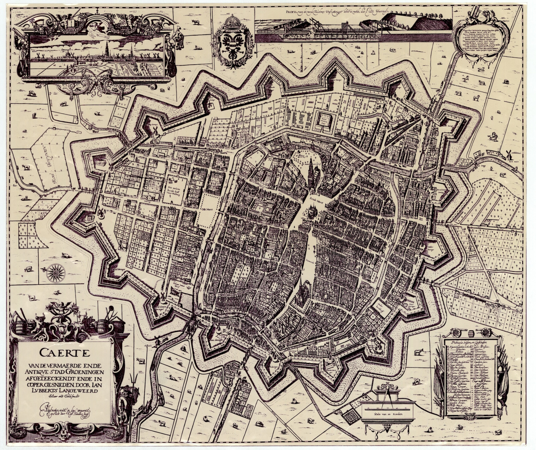 Terwijl Egbert Haubois de eerste hand legt aan zijn kaart van Groningen, is de Tachtigjarige Oorlog nog niet voorbij. Wel is de stad inmiddels vrij van de Spaanse overheersing die meer dan twee decennia heeft geduurd. Groningen werd in 1568 ingenomen door de Spaanse hertog van Alva en zijn Waalse soldaten. Toen de soldaten in 1577 vertrokken, had alleen het Ommeland zich aangesloten bij de Unie van Utrecht, de stad niet. Onder leiding van stadhouder Rennenberg keerde de stad in 1580 zelfs weer terug onder het gezag van de Spaanse koning Filips II; uiteraard tot groot ongenoegen van prins Maurits, de Friese stadhouder graaf Willem Lodewijk en de ommelanden. De Friese graaf en zijn leger probeerden de stad vervolgens te ‘reduceren’; weer terug te brengen tot de Nederlanden. Uiteindelijk duurde deze reductie van Groningen tot 1594. Op 23 juli van dat jaar nam het leger, dat zich aan de zuidzijde van de stad had verschanst, Groningen weer in. Het gewest Stad en Lande ging vervolgens als zevende, en tevens laatste, provincie deel uitmaken van de Republiek der Verenigde Nederlanden. Achtereenvolgend waren graaf Willem Lodewijk van Nassau (1595-1620), prins Maurits van Oranje (1620-1625), Ernst Casimir (1625-1632), Hendrik Casimir I (1632-1640) en Frederik Hendrik (1640-1647) stadhouders van Stad en Lande. Onder gezag van de stadhouder, werd de stad bestuurd door het College van burgemeesteren en raad (4 burgemeesters en 12 raadsheren). Het is aan dit college dat Egbert Haubois in 1631 vraagt ‘dese stadt in een coperen plaet uyt te [mogen] snyden’.