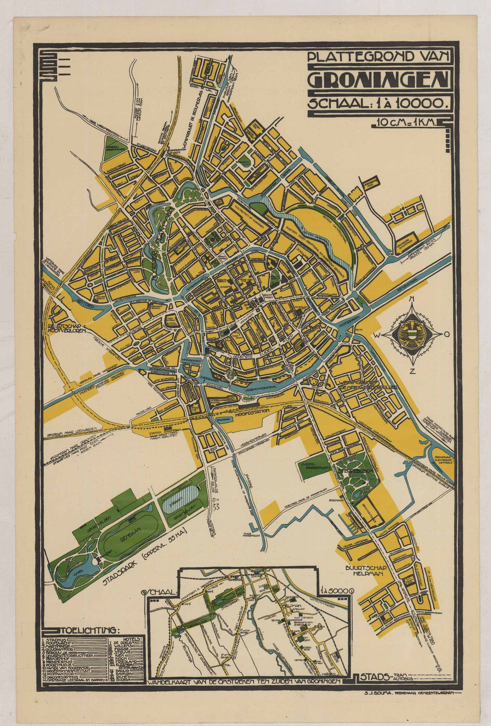 Deze plattegrond van Groningen geeft in zijn (carto)grafie een uniek tijdsbeeld. Het is het moment waarop Groningen aan het begin staat van grootschalige uitbreidingen en volop investeert in openbare bouwkunst. In het noorden is zojuist de Tuinbuurt verrezen, in het noordoosten zijn de Korrewegwijk & De Hoogte in aanleg en onder het Hoofdstation in het zuiden is de kleine Grunobuurt al gebouwd. Het dorpje Helpen, inmiddels Helpman geheten, behoort bij de stad. In het westen, voorbij het nieuw gegraven Gorechtkanaal, tekent zich de eerste bebouwing van de Oosterparkwijk af. Het kleine buurtje boven het openbaar slachthuis is het begin van de bloemenbuurt die ontworpen is door de kaartmaker zelf. Op de plek waar zich het academisch ziekenhuis bevindt, ligt de nog te dempen Singelgracht; een overblijfsel van de zeventiende-eeuwse vestingwerken. In het noordoosten hebben deze aan het einde van de negentiende eeuw al plaatsgemaakt voor het Noorderplantsoen, waarin de Kiosk een aantal jaren later vervangen zal worden door het paviljoen naar een ontwerp van de kaartmaker.