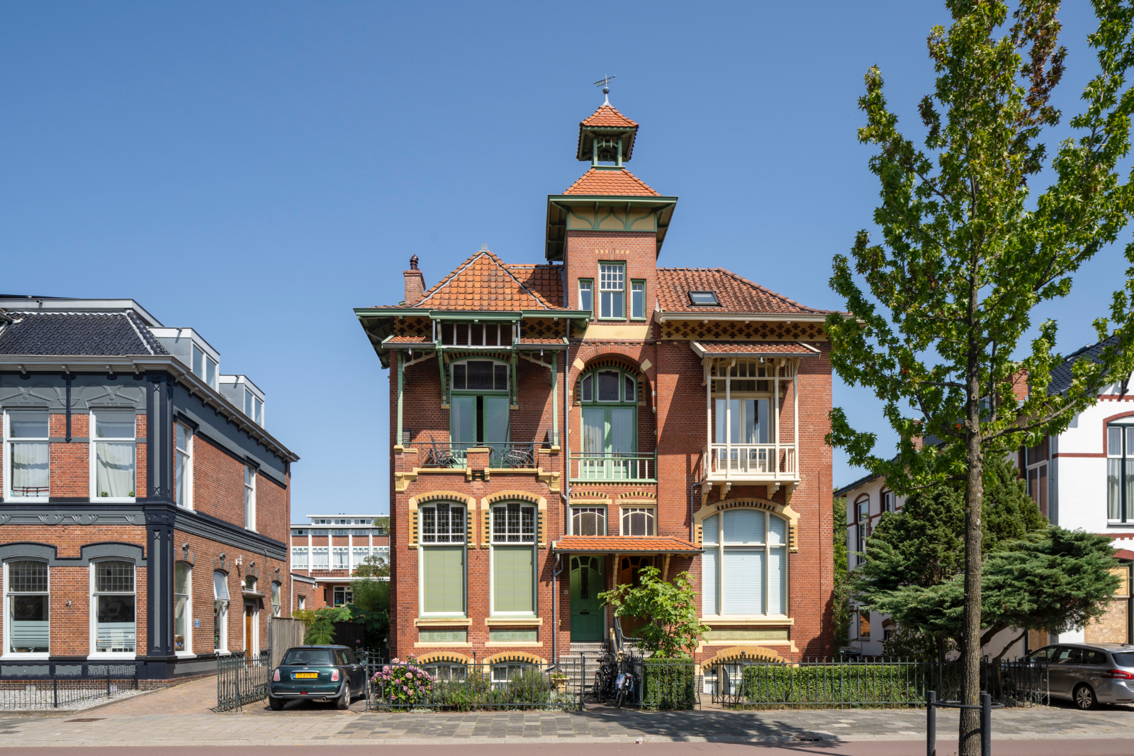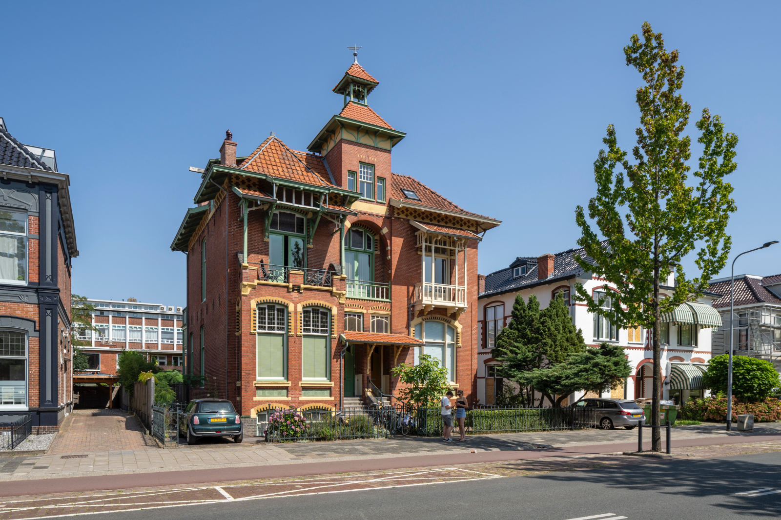 De dubbele villa is een feest van details en rijk materiaalgebruik. Van rode Groninger baksteen en natuurstenen lateien tot Friese pannen en zeegroene tegels van de Duitse aardewerkfabriek Offstein A.G. Maar wie is de architect? De archieven geven geen uitsluitsel. Eigenlijk is er maar een optie mogelijk: A.Th van Elmpt, die in de vroege twintigste eeuw volop flirt met art nouveau en de chaletstijl-invloed ook niet schuwt. Kijk maar eens naar Huize Tavenier 5 of het als apotheek met bovenwoning gebouwde snoepje aan het Zuiderpark 18.