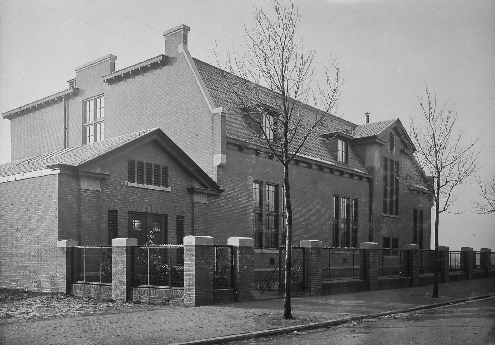 De ingangspartij zit in het rechter gedeelte van de voorgevel en is voorzien van een bakstenen stoep. Ze bestaat uit een stel dubbele deuren met smalle hoge bovenlichten in een bakstenen omkadering. Het linker geveldeel met de voormalige gymnastiekzaal bevat twee driedelige vensterpartijen met roedeverdeling in onderramen en bovenlichten met strekken. Het voordakschild bezit hiermee corresponderend twee houten dakkapellen met ramen met een roedeverdeling; boven de ingang en met de breedte hiermee corresponderend een dubbele dakkapel. De achtergevel bevat op begane grond en verdieping reeksen van driedelige raampartijen tussen gemetselde muurdammen. De ramen hebben een roedeverdeling in de onderramen en bovenlichten en zijn voorzien van granieten vensterbanken.