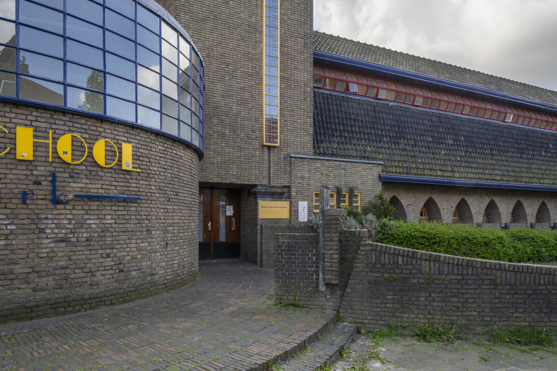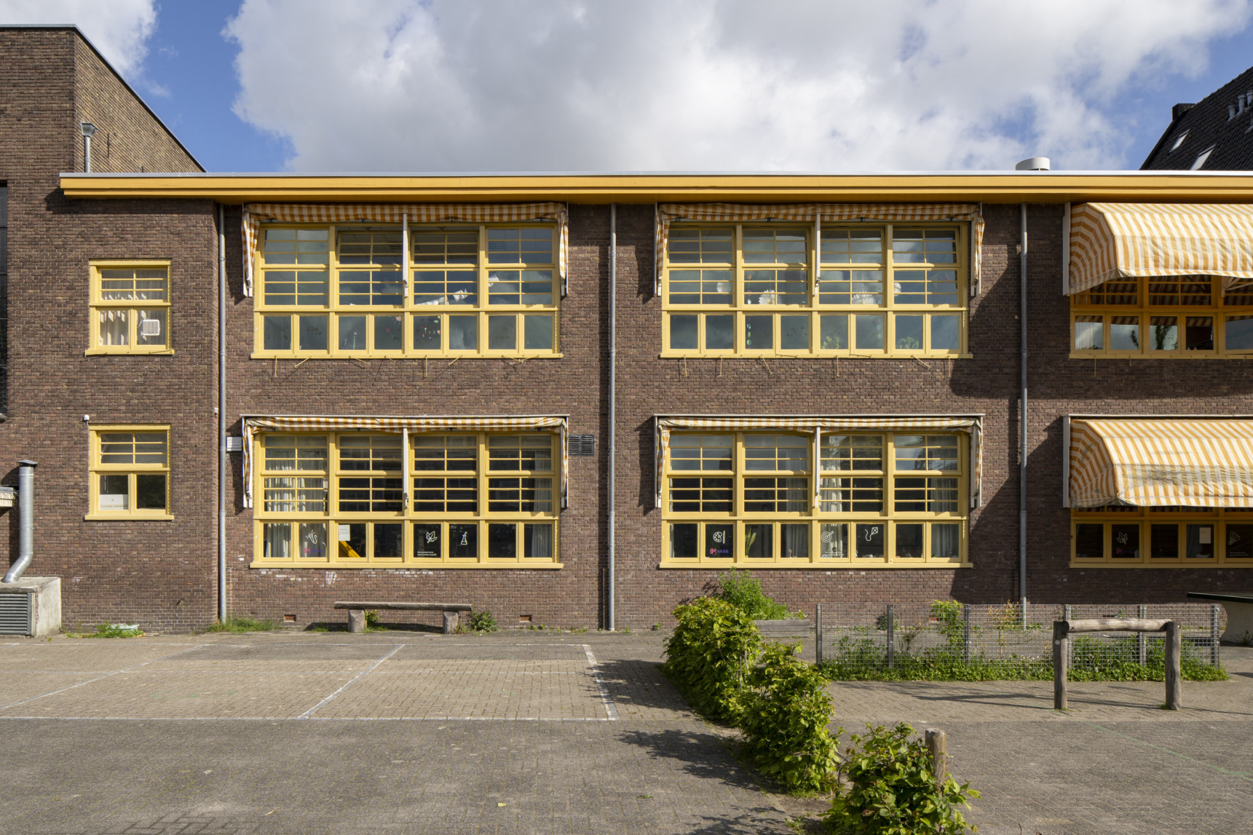 De verticale variant van deze lichtelementen wordt aan weerszijden van het voormalige gymnastieklokaal toegepast. Een laag gemetseld muurtje geeft de scheiding aan tussen het openbare gebied en het terrein van de school.