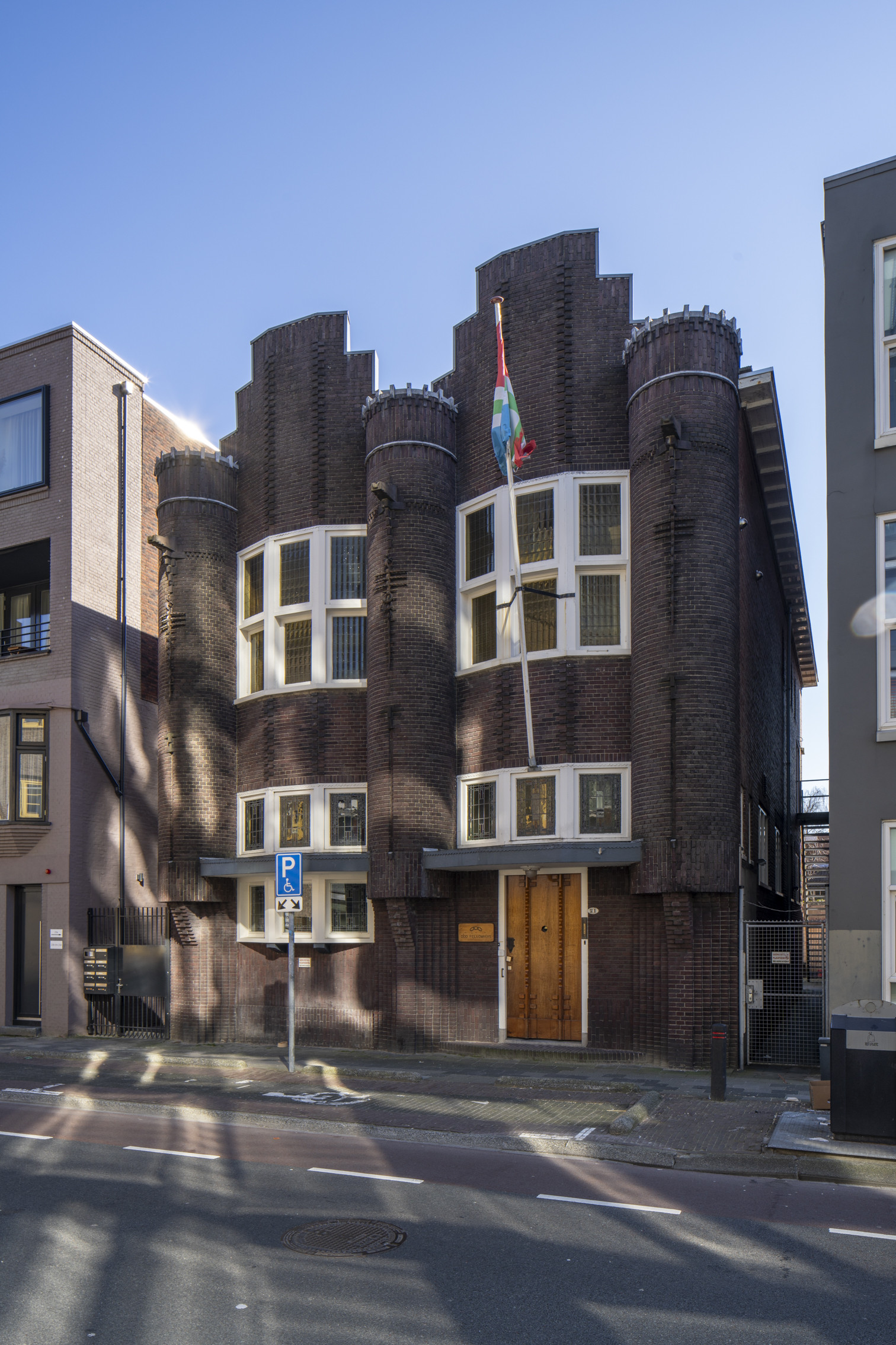 De voorgevel is uit donkere bakstenen opgebouwd; op de dakrand zijn twee getrapte muurvlakken geplaatst. Het front heeft op sommige plekken siermetselwerk. Bovendien zijn aan de drie pilaren onder de dakrand ornamenten aangebracht. De ramen zijn voorzien van glas-in-lood. Een fraaie deur geeft toegang tot het gebouw. De bovenste bouwlaag is ondiep, wat aan de zijkant goed te zien is.