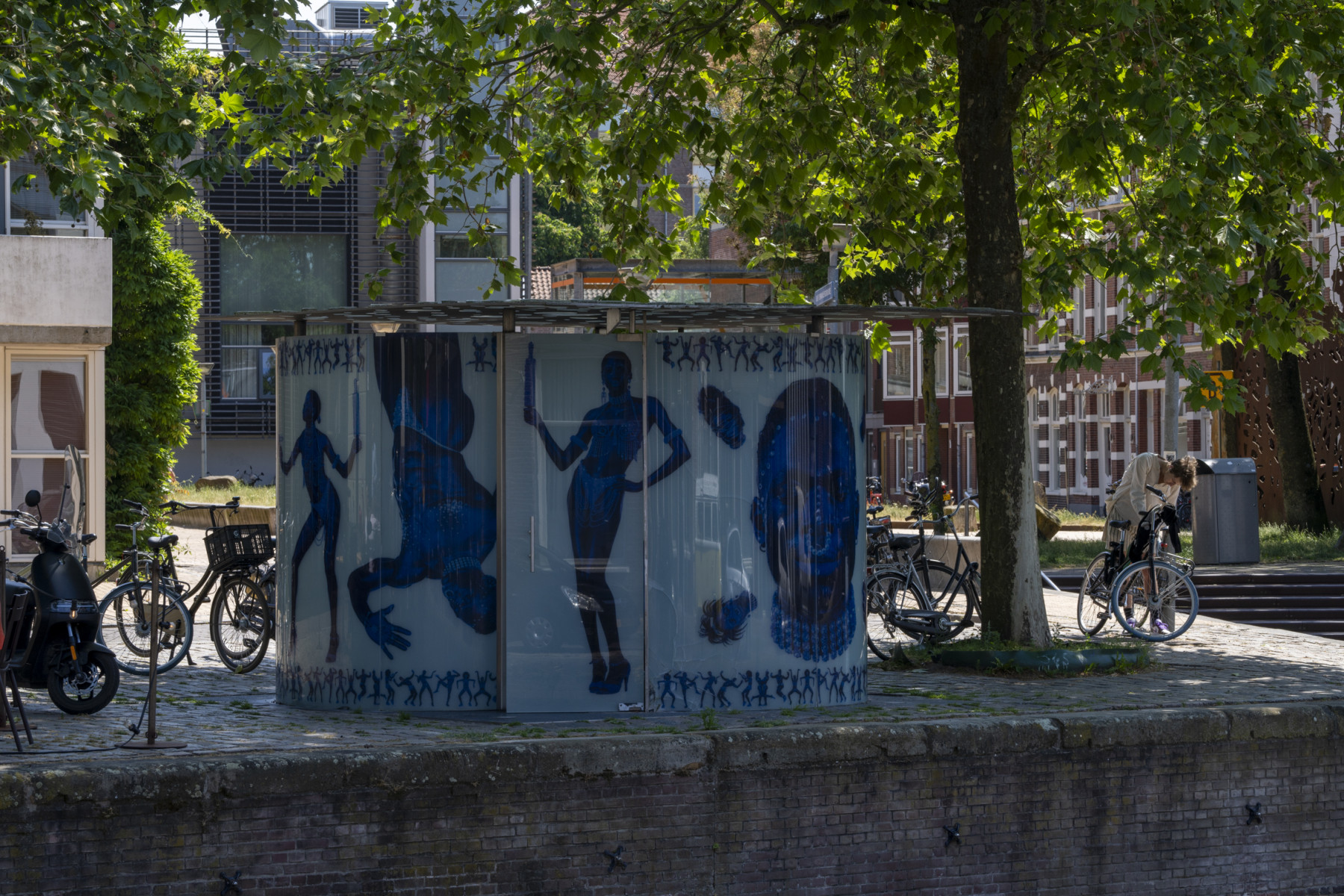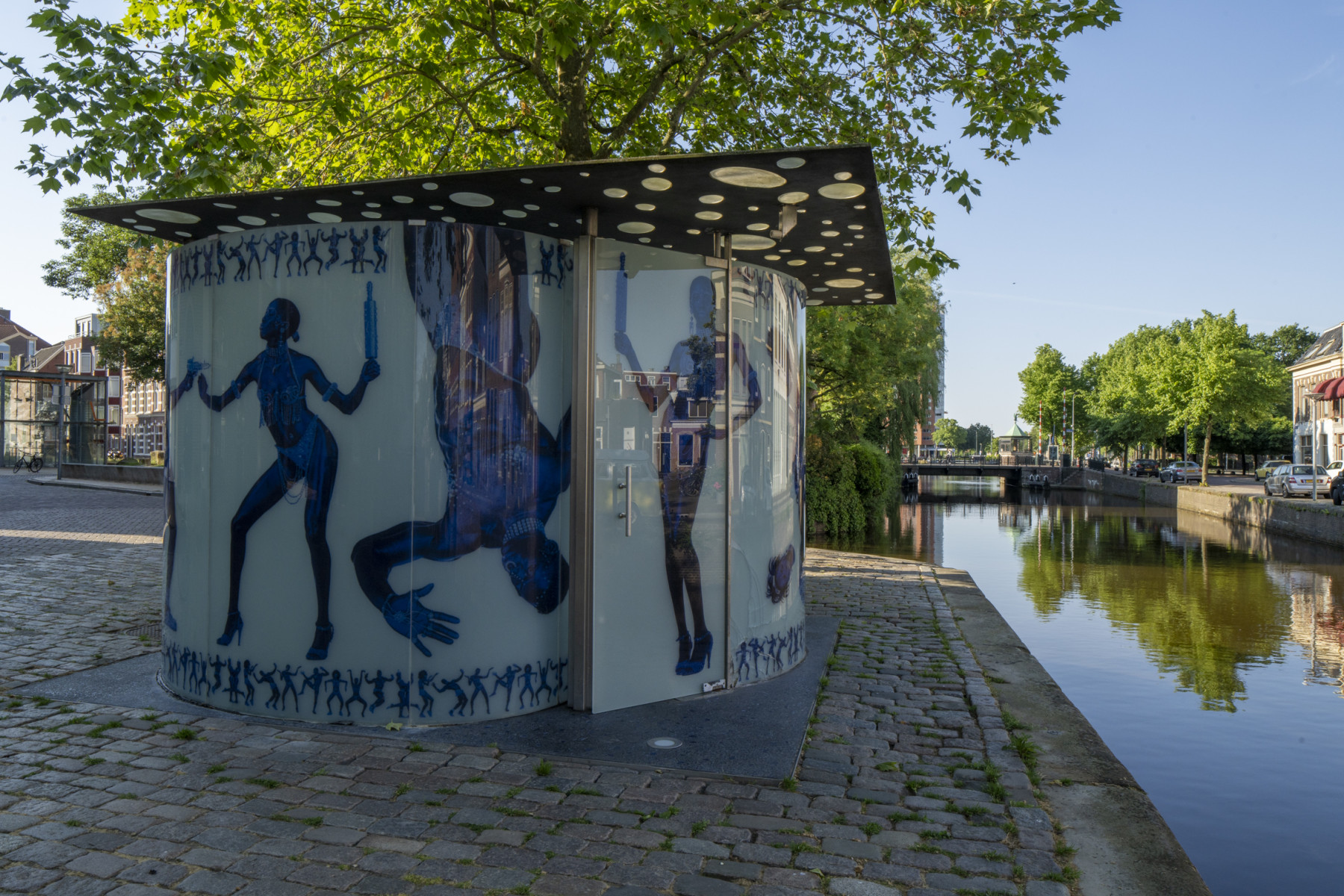 Bijzonder aan dit toiletgebouw is dat het niet alleen een afdeling voor heren maar ook voor dames heeft; elk met een eigen ingang. In de melkglazen wanden is een fotocollage te zien van Erwin Olaf in blauwe en dieppaarse tinten tegen een effen, lichte achtergrond. De foto’s verbeelden ‘de strijd der seksen’: exotische dames en heren gaan elkaar speels te lijf. Ze zijn gekleed in parels en diamanten en uitgerust met stereotype attributen als een deegroller, een zwaard, bokshandschoenen en een speelgoedpistool. In de boven- en onderrand keren de figuren als een soort decoratieve rand terug. ’s Avonds wordt het toilet van binnenuit verlicht.