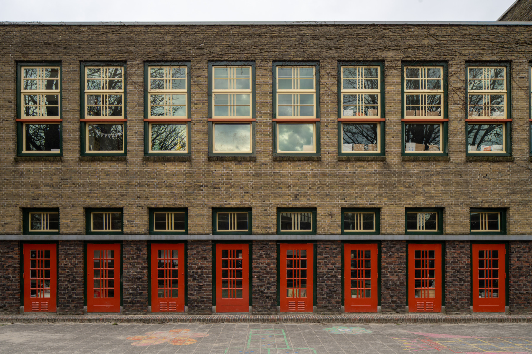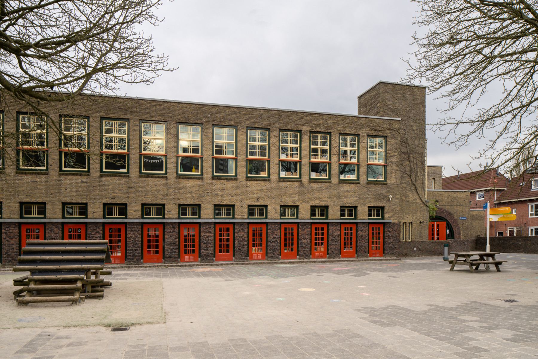 De rest van het gebouw is opgetrokken uit een lichtere geelbruine steen, die veel rechthoekiger en gelijkmatiger is. In de hoek van het gebouw, waar de entree overgaat in de klaslokalen, is het trappenhuis als apart torenachtig bouwdeel vormgegeven. Het trappenhuis is voorzien van een groot venster dat is opgedeeld in kleine ruitjes. De klaslokalen kennen ook veel glas (in ramen en deuren), terwijl de vensters in de entree en de dienstruimtes smal en hoog zijn.