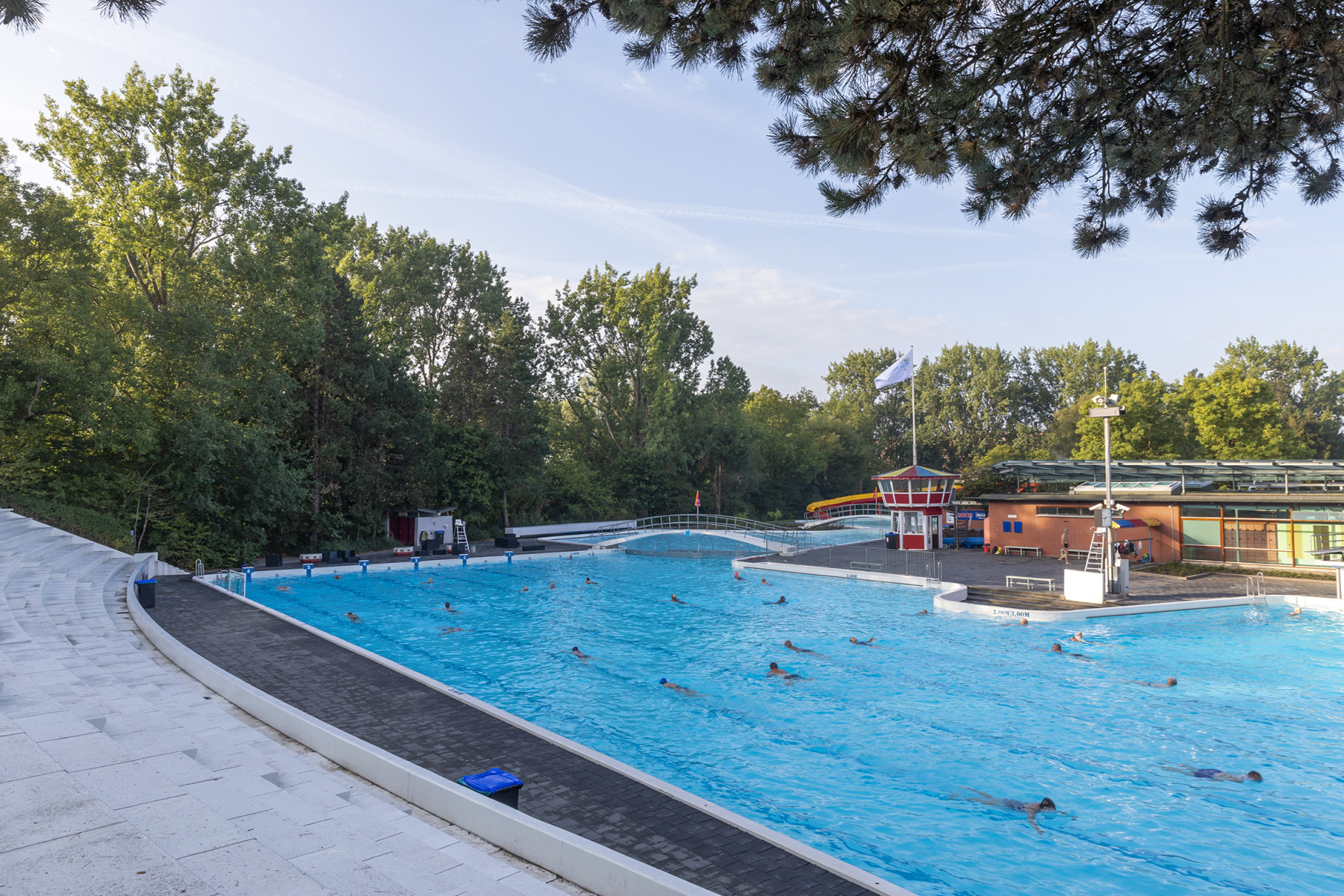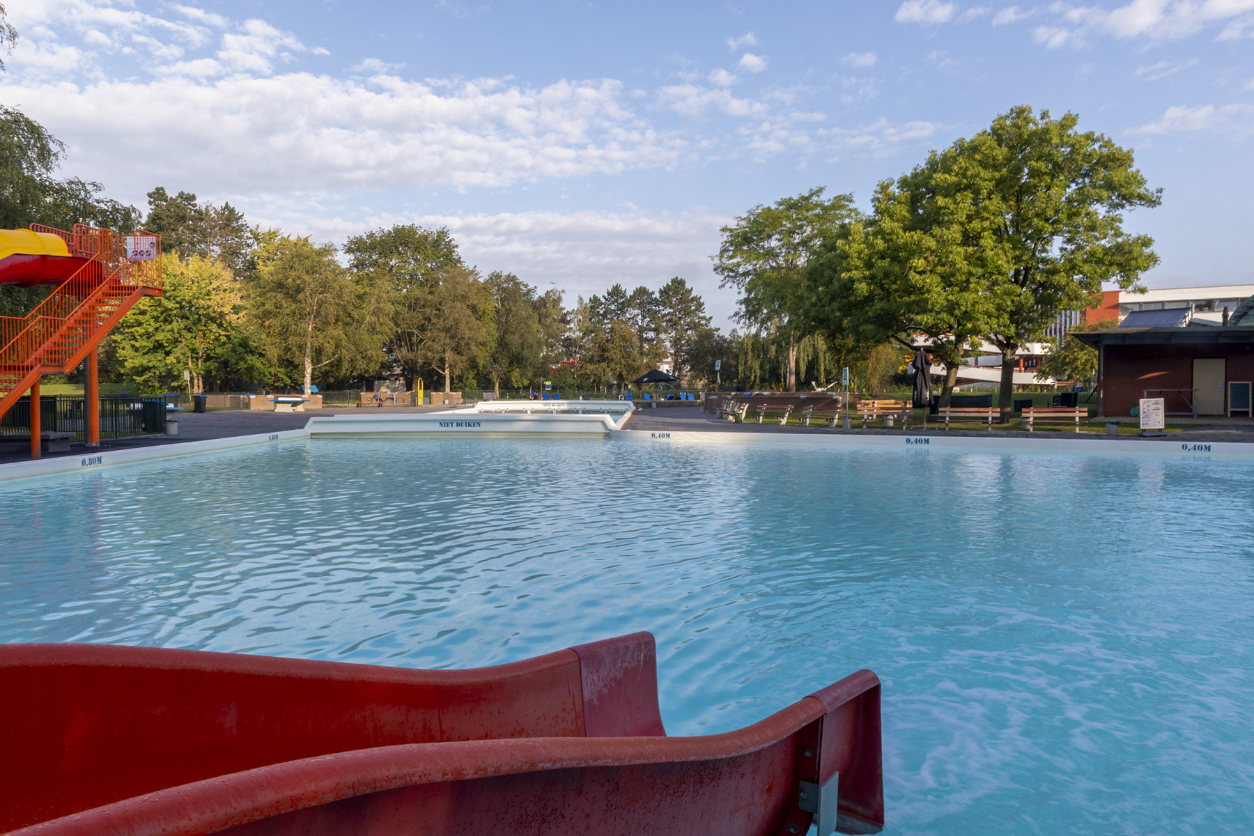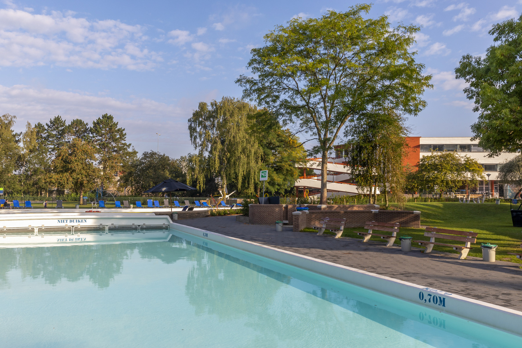 In een kring liggen vijf verschillende bassins: van wedstrijdbad tot kleuterbadje. Een speelveld en een zonneweide maken de ‘moderne recreatieplek’ af. Aan de zuidkant van het hoofdgebouw plaatst Koolhaas een groot, hoog terras. Vanuit de lucht vormen de baden en het hoofdgebouw een bijna aaneengesloten vijfhoek: een knipoog naar de historische Helperlinie waar het zwembad aan grenst. Tussen de baden ontwerpt Koolhaas betonnen boogbruggen. De tribune bij het wedstrijdbad biedt in de jaren vijftig en zestig bij (internationale) zwemwedstrijden plaats aan 900 toeschouwers. De tribunewand beschikt over kleurige wandschilderingen die bij de restoratie van 2018 in ere zijn hersteld.