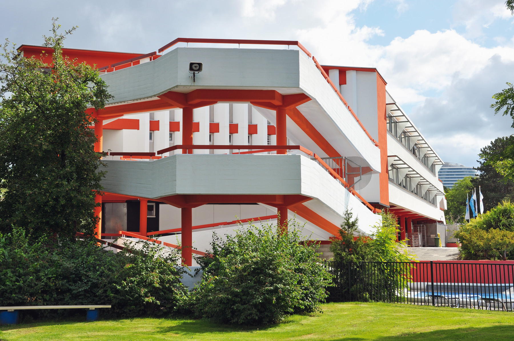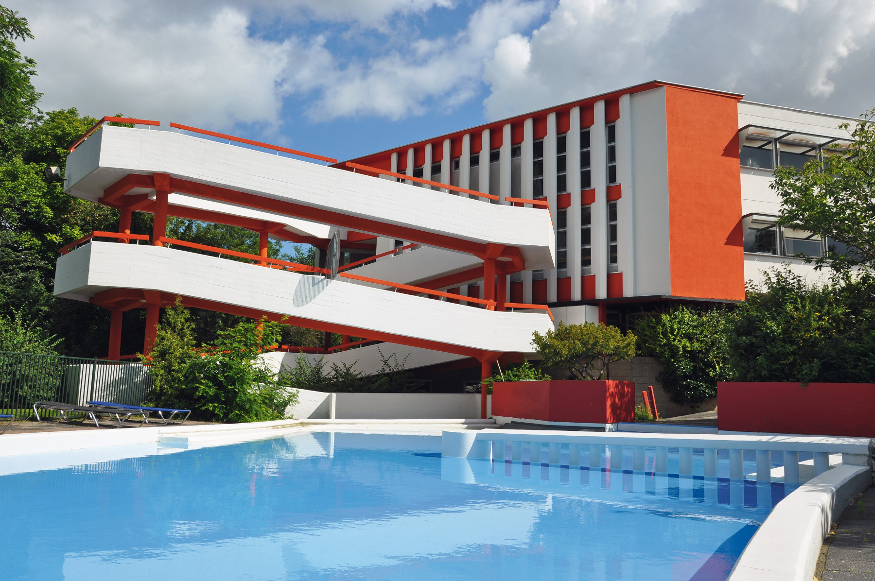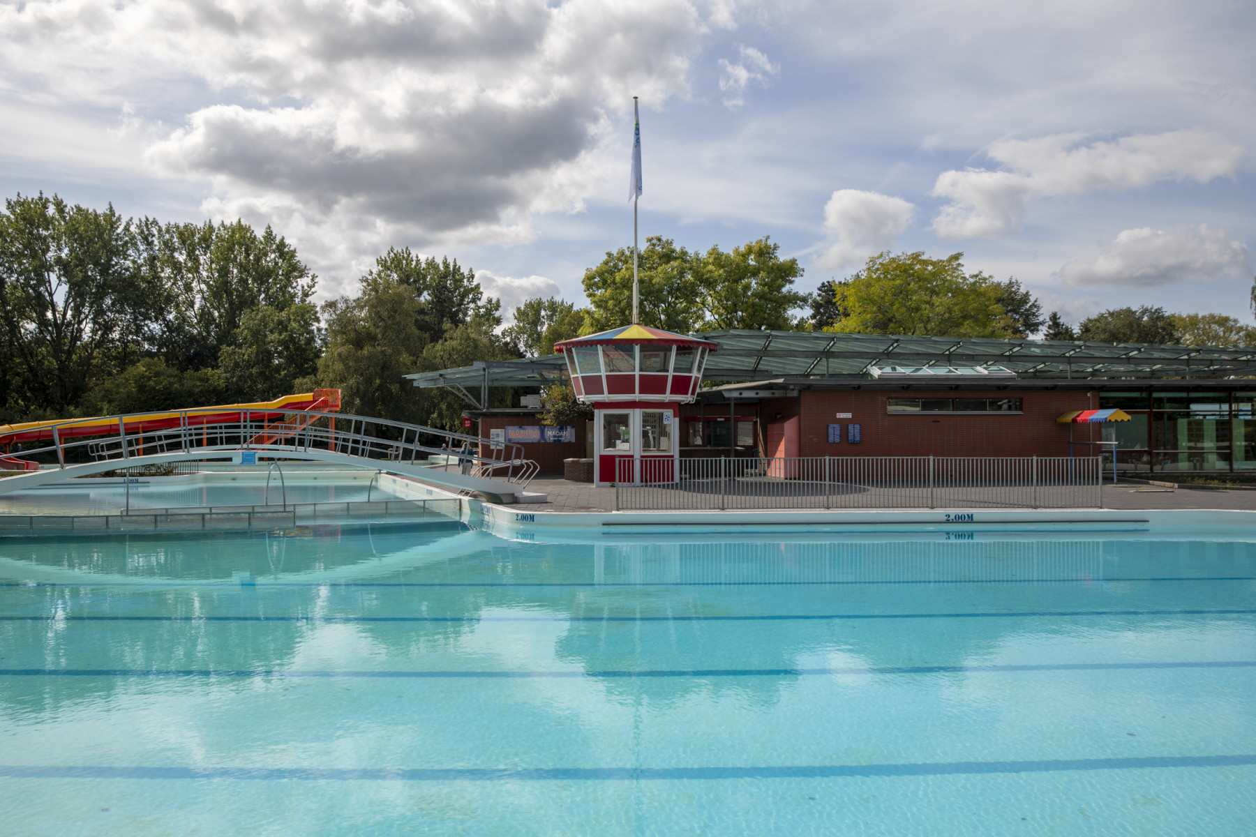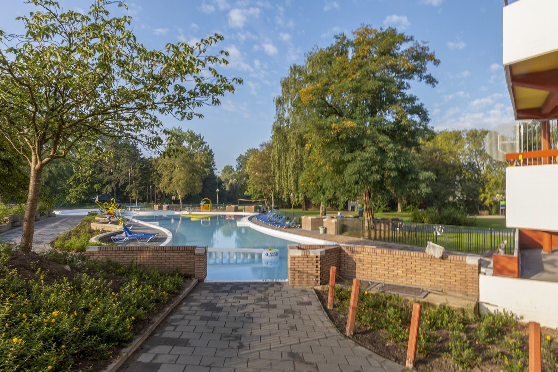 In een kring liggen vijf verschillende bassins: van wedstrijdbad tot kleuterbadje. Een speelveld en een zonneweide maken de ‘moderne recreatieplek’ af. Aan de zuidkant van het hoofdgebouw plaatst Koolhaas een groot, hoog terras. Vanuit de lucht vormen de baden en het hoofdgebouw een bijna aaneengesloten vijfhoek: een knipoog naar de historische Helperlinie waar het zwembad aan grenst. Tussen de baden ontwerpt Koolhaas betonnen boogbruggen. De tribune bij het wedstrijdbad biedt in de jaren vijftig en zestig bij (internationale) zwemwedstrijden plaats aan 900 toeschouwers. De tribunewand beschikt over kleurige wandschilderingen die bij de restoratie van 2018 in ere zijn hersteld.