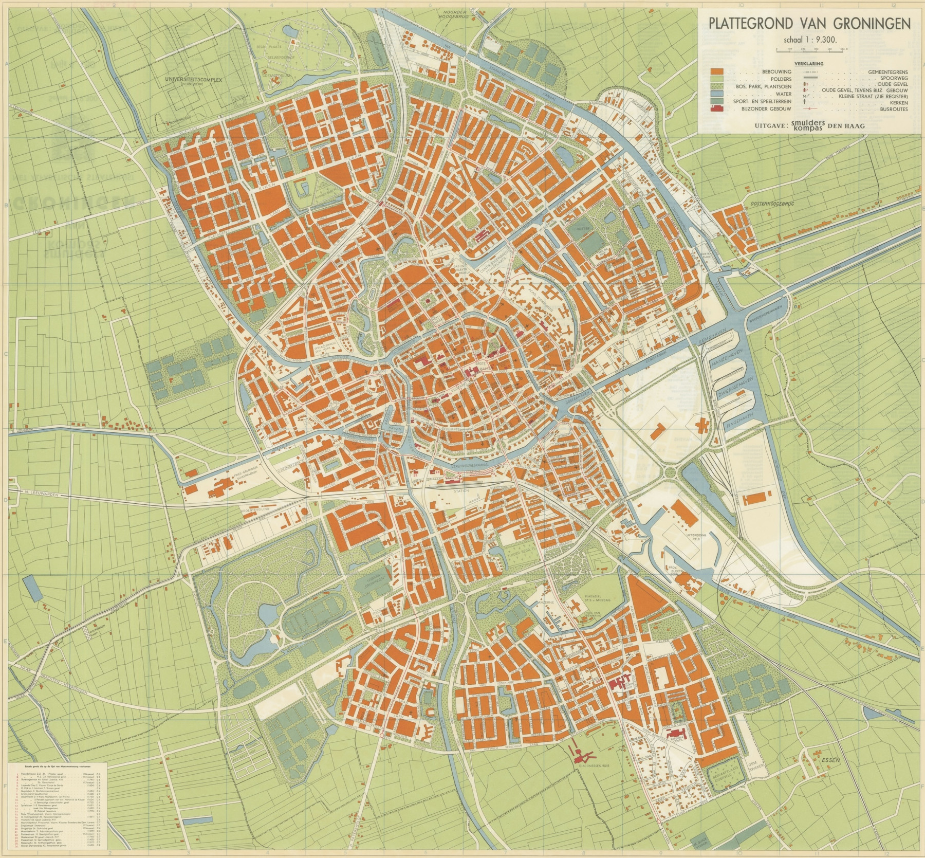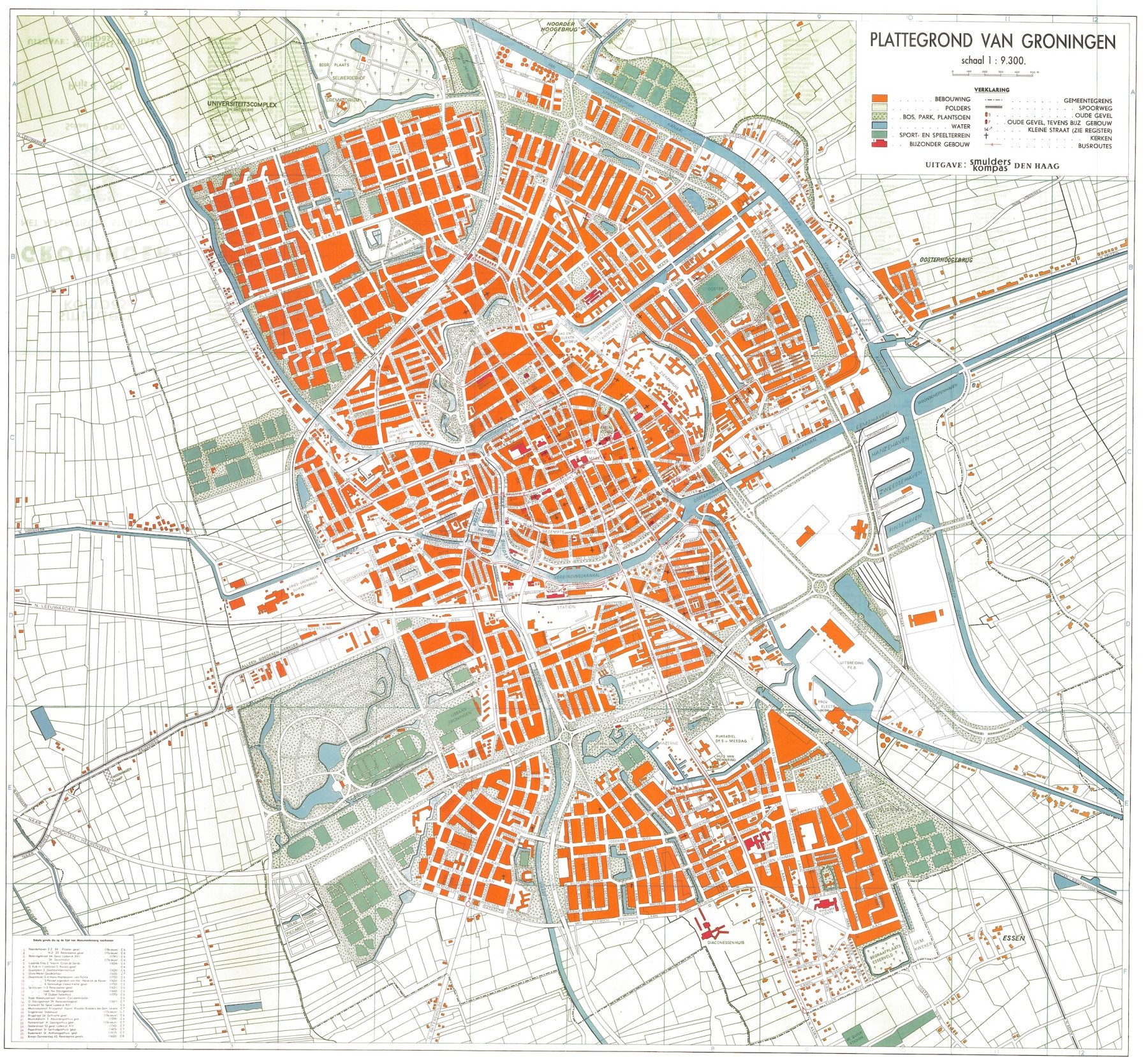 Groningen is in 1965 een compacte stad met 150.000 inwoners. De kaart geeft een mooi inzicht in de groei die de stad op dat moment doormaakt. Rond het centrum en de vooroorlogse bebouwing van de Oranjewijk en de Rivierenbuurt zijn nieuwe naoorlogse wijken verrezen: Selwerd en Paddepoel in het noorden, Corpus den Hoorn, De Wijert en Coendersborg in het zuiden. De grenzen van deze stad zijn hard. Vanuit de randen van Paddepoel heeft men vrij zicht over de landbouwgronden. Hetzelfde geldt voor de zuidelijke wijken en de vroeg-naoorlogse randen van de Korrewegwijk en de Oosterparkwijk: Noorderhogebrug en Oosterhogebrug.