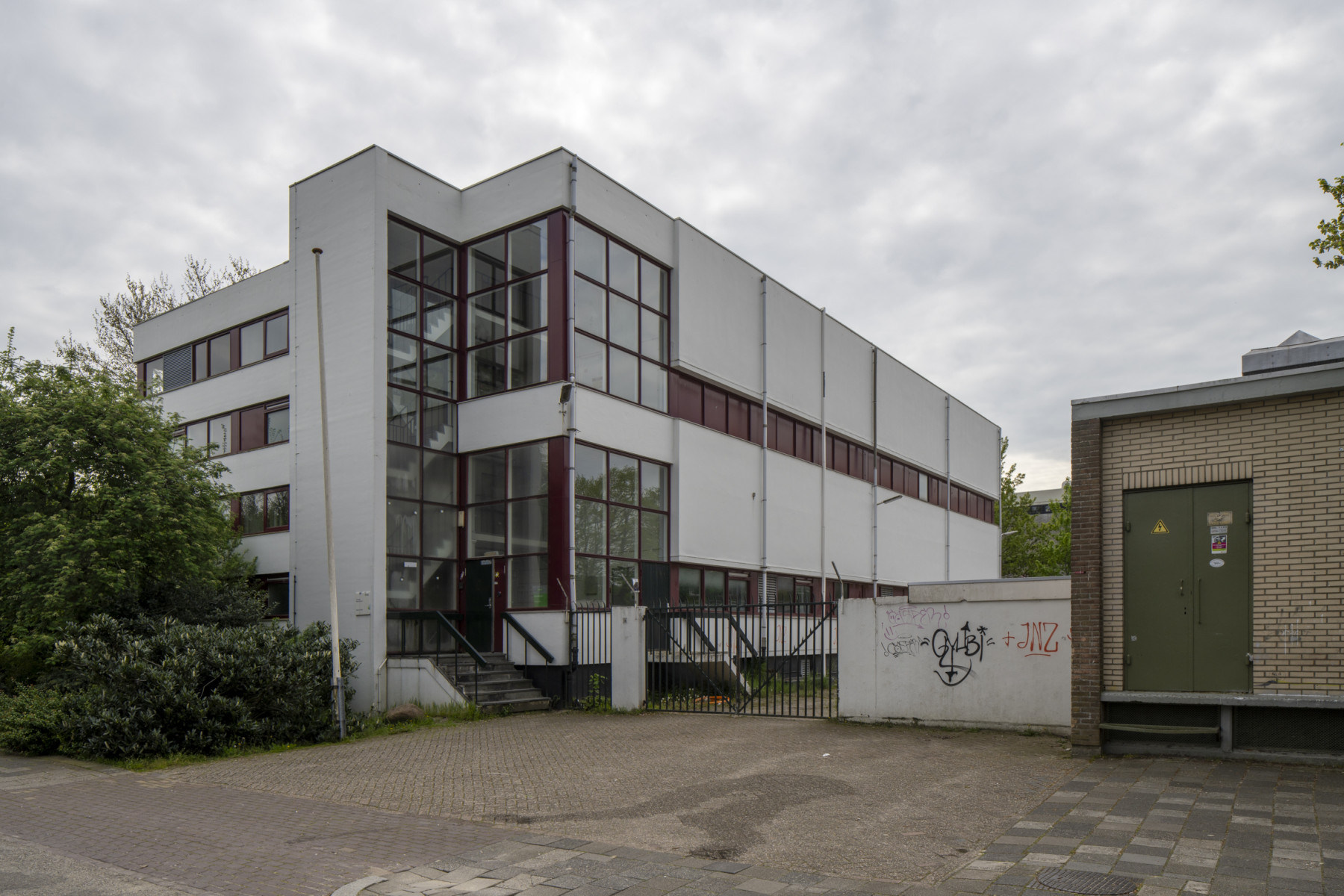 Een gesloten doos doet aan traditionele gebouwen met dragende muren denken. In de jaren zestig waren betonnen vloeren gedragen door kolommen de laatste stand van de bouwtechniek. Als expressie van die draagstructuur werden strookvensters toegepast: ‘de gevel is niet dragend’. Zo ook in dit gebouw: in alle ruimten zijn vensterstroken op uitzichthoogte geplaatst, met ramen in een bijna vierkant formaat. De bewegende delen zijn uitzetramen. Alle muren zijn wit in de modernistische traditie, zodat het materiaalgebruik moeilijk is af te lezen.