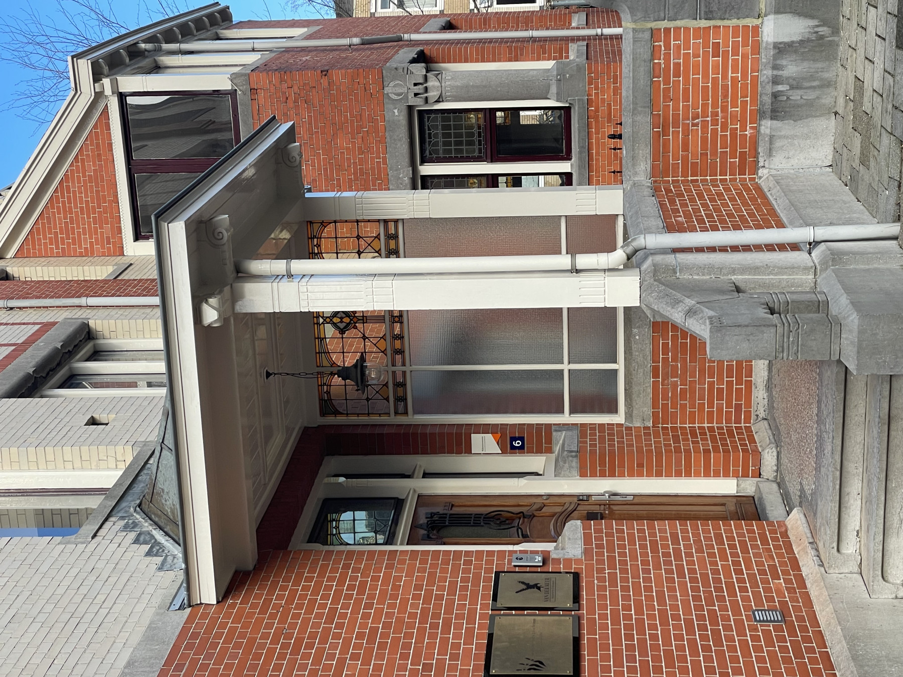 De grote ronde erkers ter hoogte van de begane grond en eerste verdieping aan de voorzijde vergroten het uitzicht op het Emmaplein. In de bovenlichten zijn glas-in-lood ramen aangebracht. Nadat het pand in 1919 van eigenaar wisselde is de entree aan de voorzijde omgebouwd tot vensterraam.