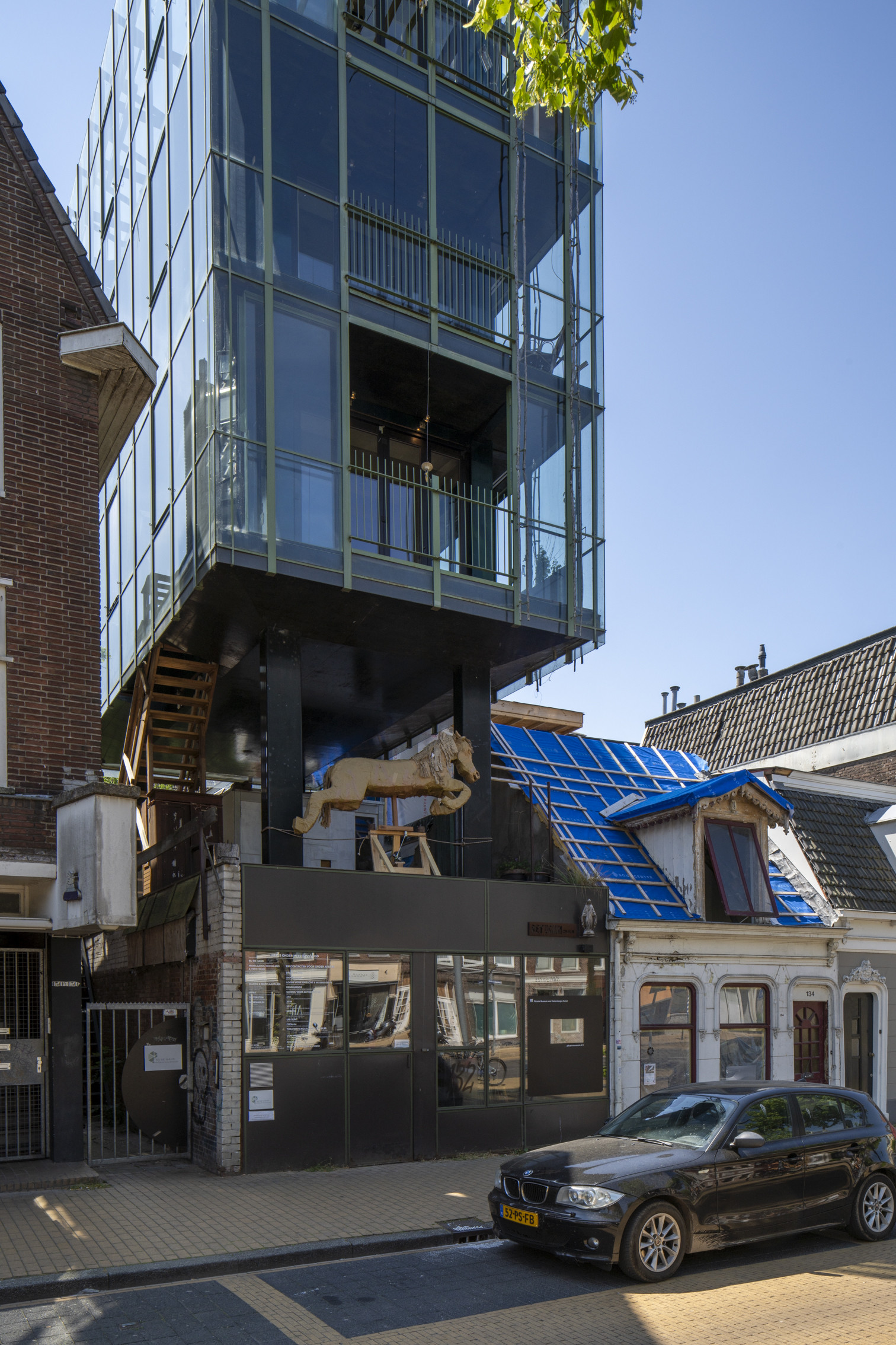 Het sparen van de tuin was uitgangspunt in het ontwerp. Door deze als een vlak op te laten lopen richting het Zuiderdiep ontstond ruimte voor de entree en de stalling van motor en paard op straat- niveau. Met de verdiepingshoge open tuinruimte blijft het zicht vanaf het Zuiderdiep op de boom in de tuin gewaarborgd.